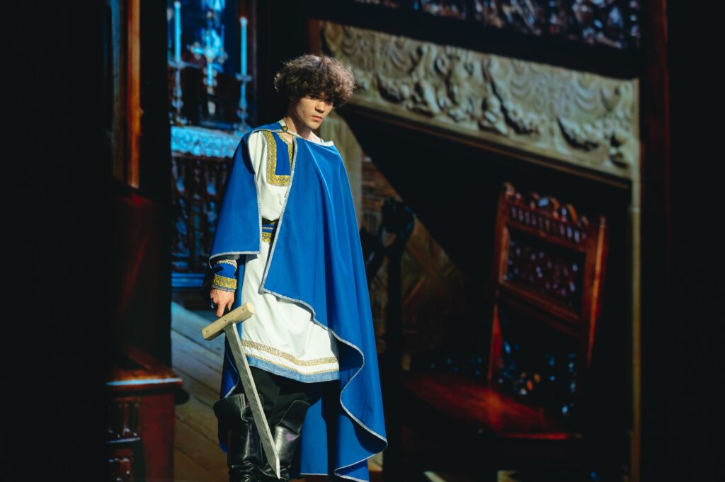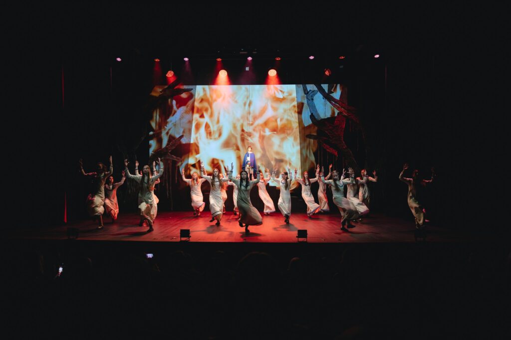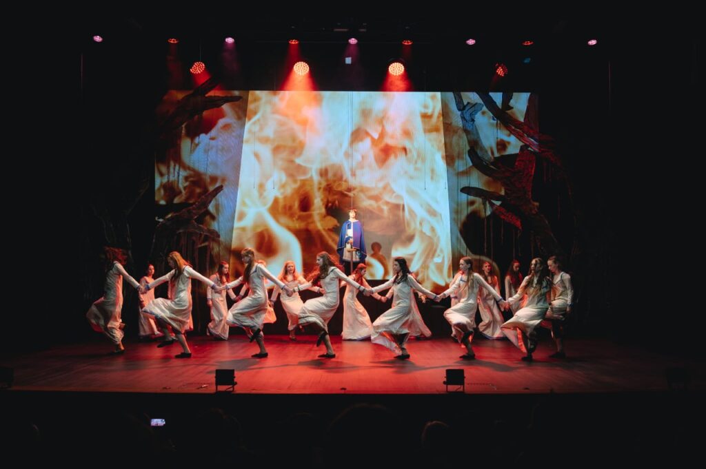 Спектакль держал в напряжении с первых минут, включал грандиозные массовые эпизоды, неожиданные сценические решения, постановку сопровождали яркие хореографические номера — все это помогало актерам показать и передать внутреннюю борьбу главного героя.